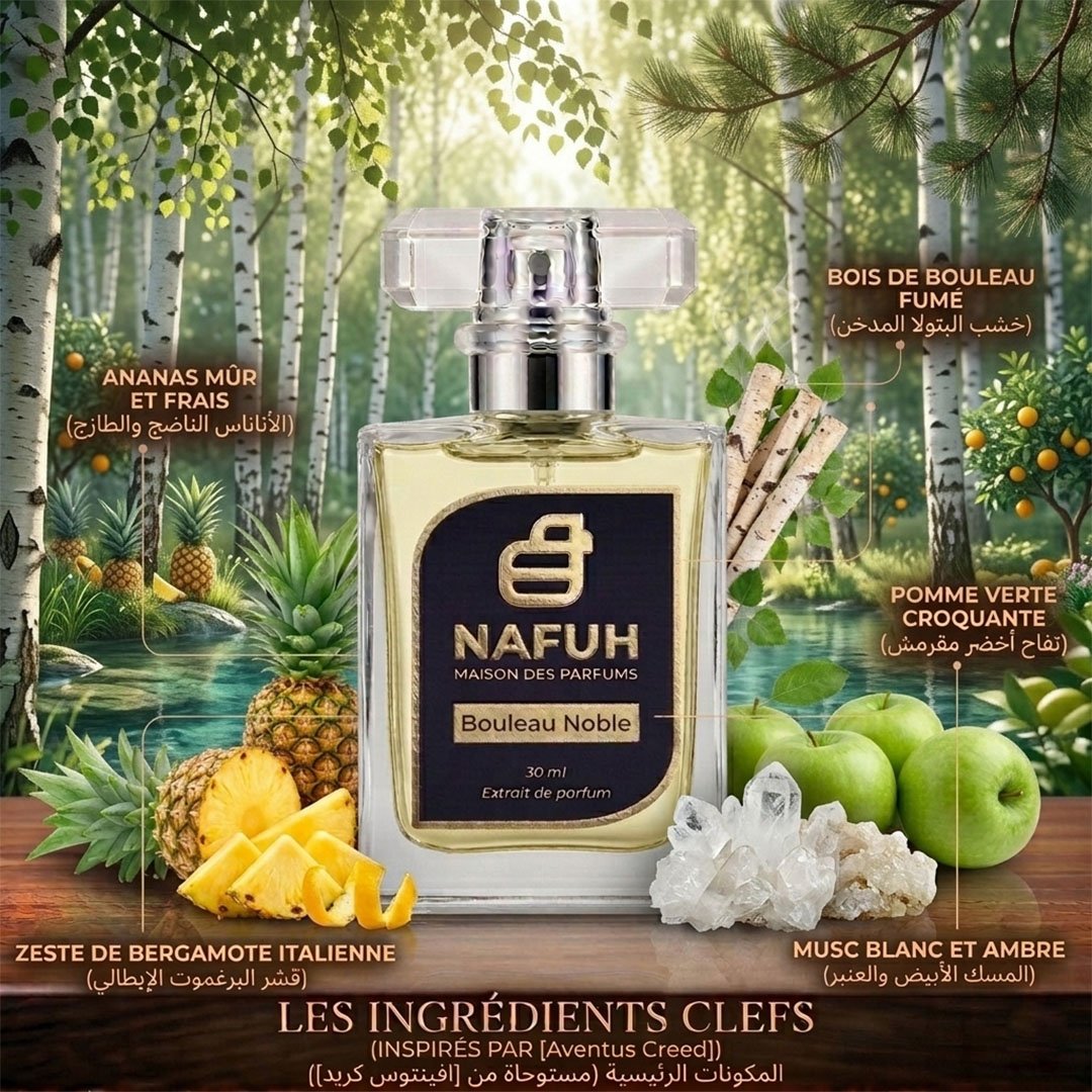 Bouleau Noble est le parfum du succès. Inspiré de Aventus (Creed), il combine fraîcheur fruitée et profondeur boisée avec brio. Une signature royale pour viser l’excellence.